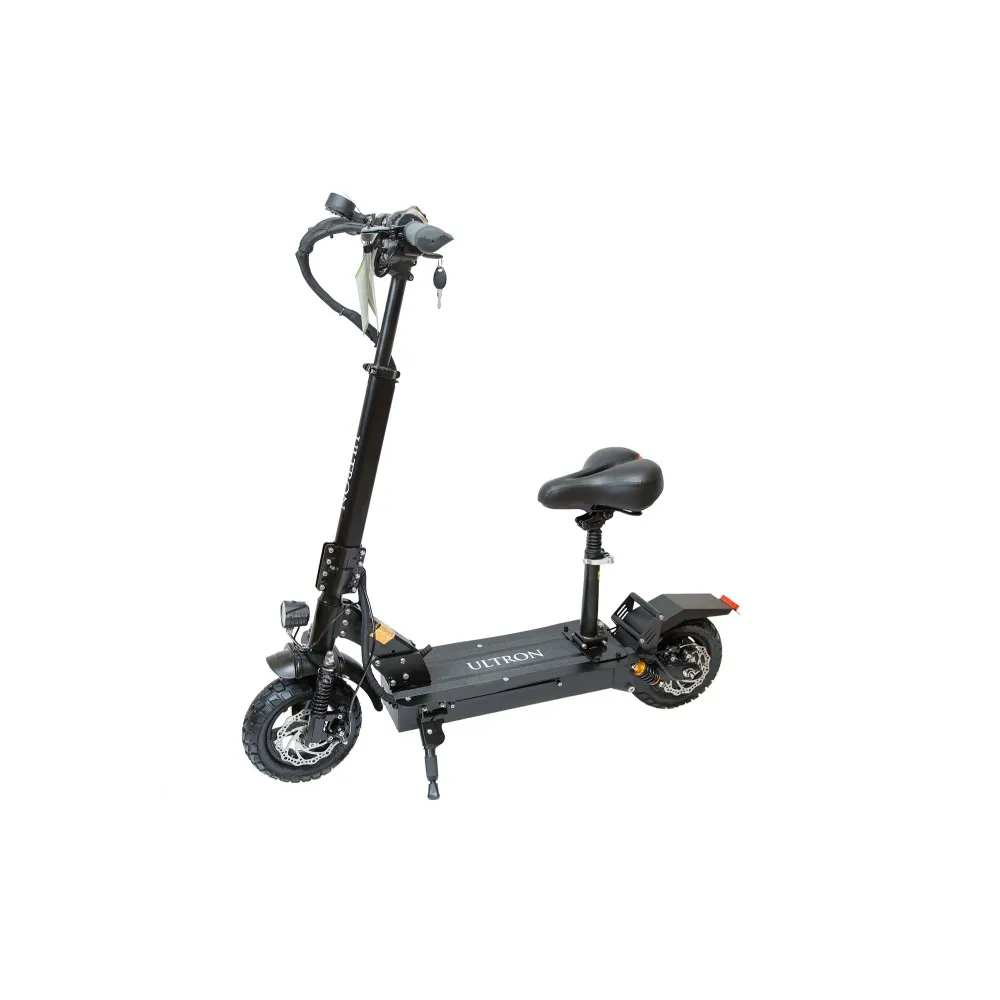 Для большей устойчивости ULTRON T103 имеет увеличенную ширину колес, несмотря на приличную скорость движение достаточно уверенное. Максимально агрегат развивает до 50 км/ч. На дальних расстояниях можно использовать сидение, которое дополнительно имеет амортизацию. Сидение мягкое, его по желанию можно устанавливать или снимать.