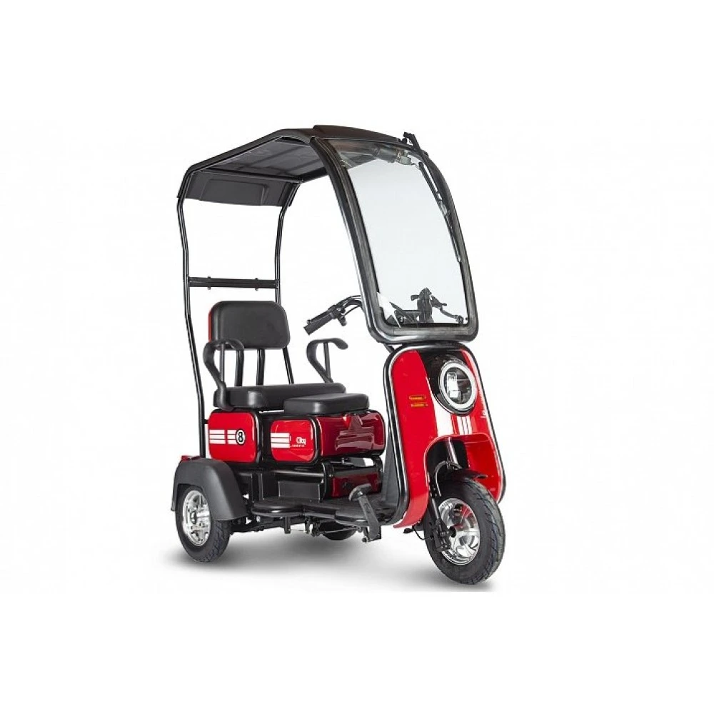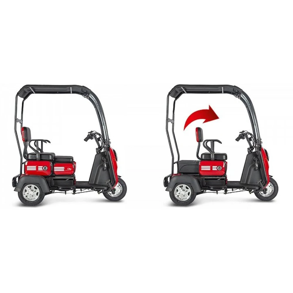 Модель рассчитана на 2-х ездоков, один из которых является пассажиром. Обустроена широкими мягкими сиденьями. Пассажирское оснащено большой спинкой и подлокотниками. При грузоподъемности 120 кг модель может одновременно перевозить взрослого и ребенка. Наличие лобового стекла и крыши повышает уровень комфорта при передвижении при неблагоприятных погодных условиях.